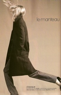 Cette semaine j'ai eu mon ELLE le lundi, comme d'hab'. Rien en kiosque le samedi malgré la grosse pub de la sortie anticipée pour cause de divorce présidentiel. Sortie samedi mais pas dans ma ville que j'aime pas, donc. Je ne dirai rien de la couv' spéciale C. S., rien du dossier sur les seins refaits mais qui devraient tomber quand même un peu pour avoir l'air vrais, rien de l'édito qui a pris le métro de Guy Môquet. Pour tout ça, je recommanderais plutôt d'aller jeter un oeil à la vidéo Infid'Elle de Violette. Non, moi je vais causer mode. En particulier d'une série qui m'a plu, pour l'idée sans doute plus que pour la réalisation, mais c'est une idée qui montre assez bien comme "la mode", ça ne veut pas dire grand-chose. Qui montre assez bien comme elle s'adapte, la mode. Comme on l'adapte, en fonction de l'humeur du jour ou de sa personnalité. Dans cette série, quelques-unes des pièces phares de la saison, montrées chaque fois en deux versions. Les photos sont de nouveau de Paola Kudacki, comme pour le style de la semaine dernière et cette fois c'est même écrit en bien plus gros, son nom. Le stylisme est signé Tamara Taichman.