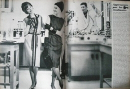Dans les premières pages du magazine (déjà envahies par la pub), une petite rubrique beauté donne des conseils pour cacher ses bigoudis. Dans les années 60, pas de brushing mais des mises en plis, avec le fameux casque chauffant chez le coiffeur voire à la maison pour les mieux équipées. Rien de bien glamour là-dedans. "Vous avez bien raison de faire vous-même vos mises en plis. Mais vous n'avez pas le droit de donner à votre mari le spectacle de vos bigoudis. alors : cachez-les sous 60 cm de résille froncée dans un élastique qui prend bien la tête." On peut acheter cette merveille pour 10 F aux Galeries Lafayette. Il en existe plusieurs modèles indique Alice Chavane. La mise en plis, je veux bien croire en effet qu'il y avait là de quoi bien se prendre la tête...