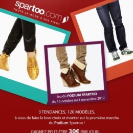 Par ailleurs, Spartoo organise jusqu'au 4 novembre un jeu concours Podium sur sa page fan Facebook, selon les modalités que vous trouverez ici en ayant liké la page.