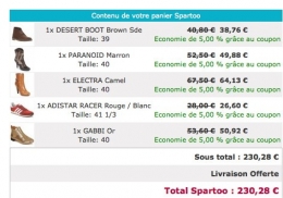 Ce qui donne un total de 230 euros pour 5 paires de chaussures, une fois déduite la remise supplémentaire liée à mon compte Premium (soit 5 % en cette période de soldes contre 10 % habituellement, plus livraison systématiquement offerte).