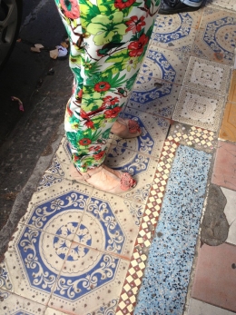 Bien loin, le voyage à Maurice, et cette mosaïque d'un trottoir de Saint-Louis, s'harmonisant au pantalon de l'amie qui m'accompagnait...